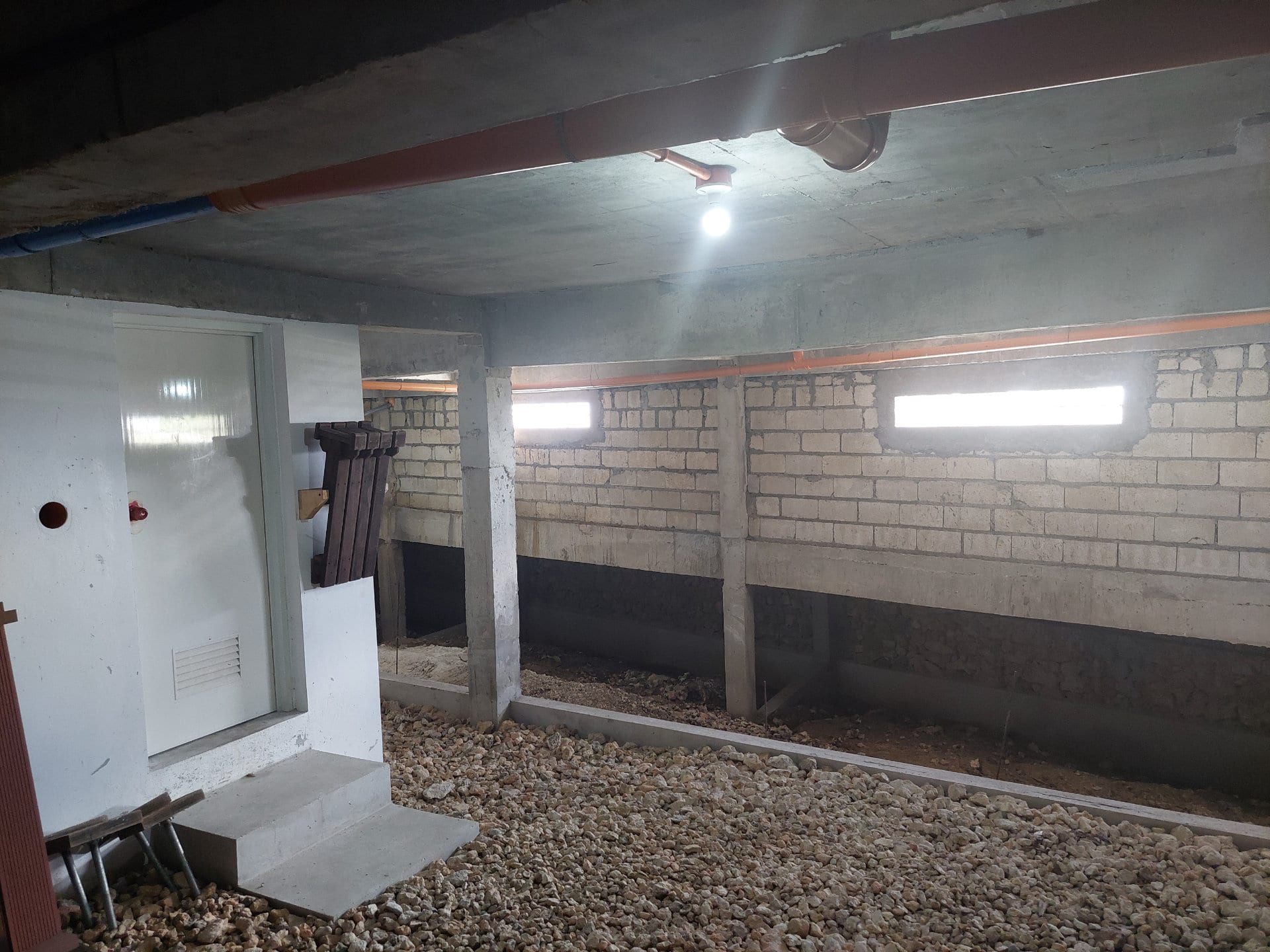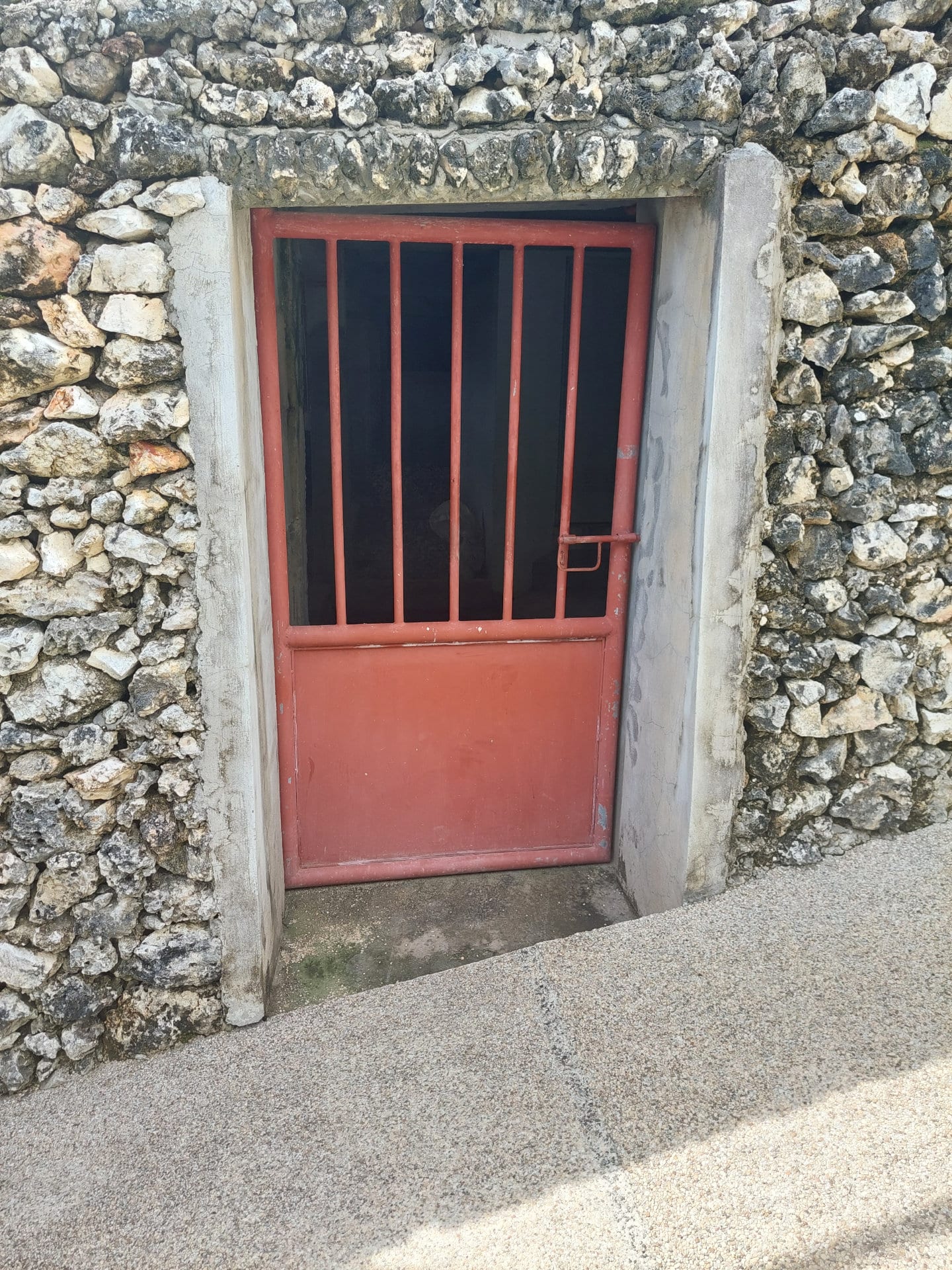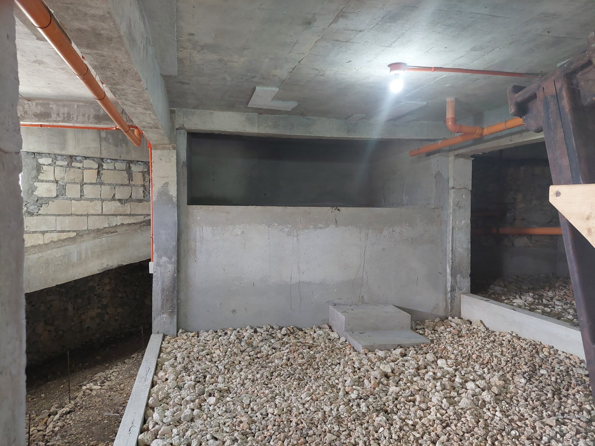 This is a 185 m² large room under the lawn in front of the house. Walls and ceiling are made of concrete and partially paved with natural stones and mortar, the floor consists of natural stone and gravel. The space can be used as a storage room or for various hobbies.