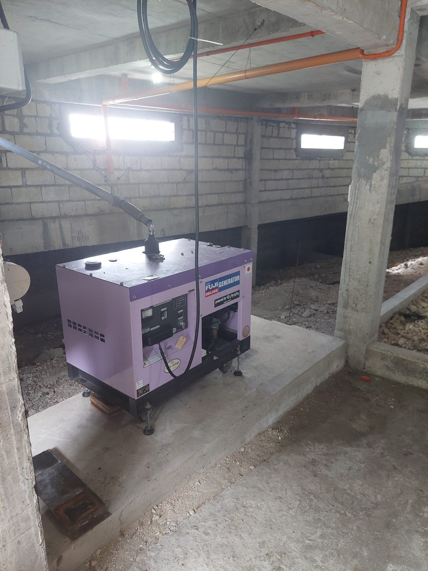 A modern 10 kW diesel generator is installed in the basement room. It supplies the entire house in the event of power outages.