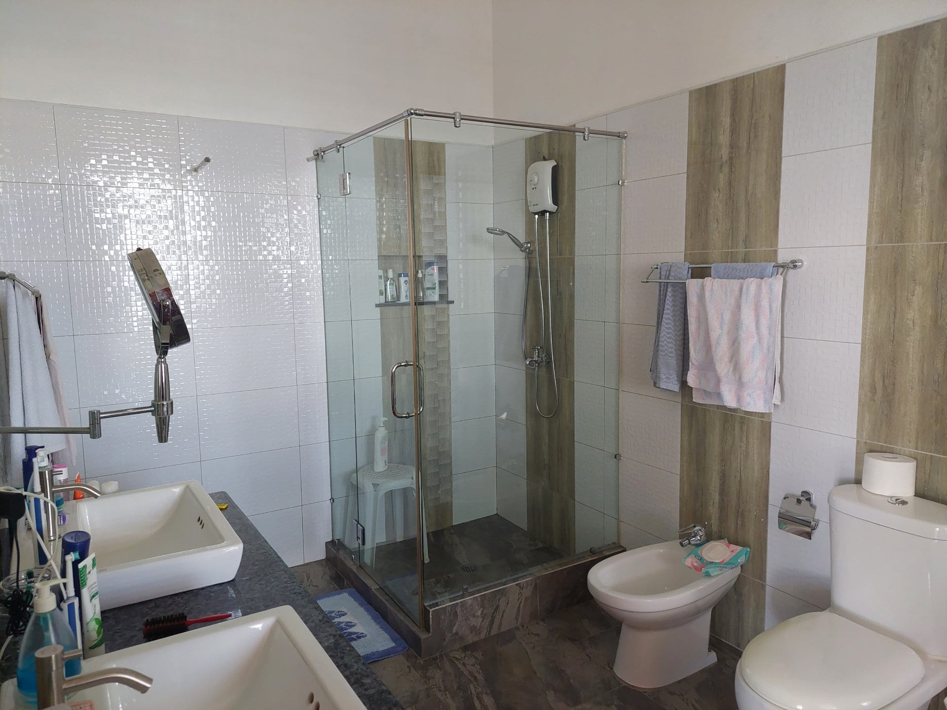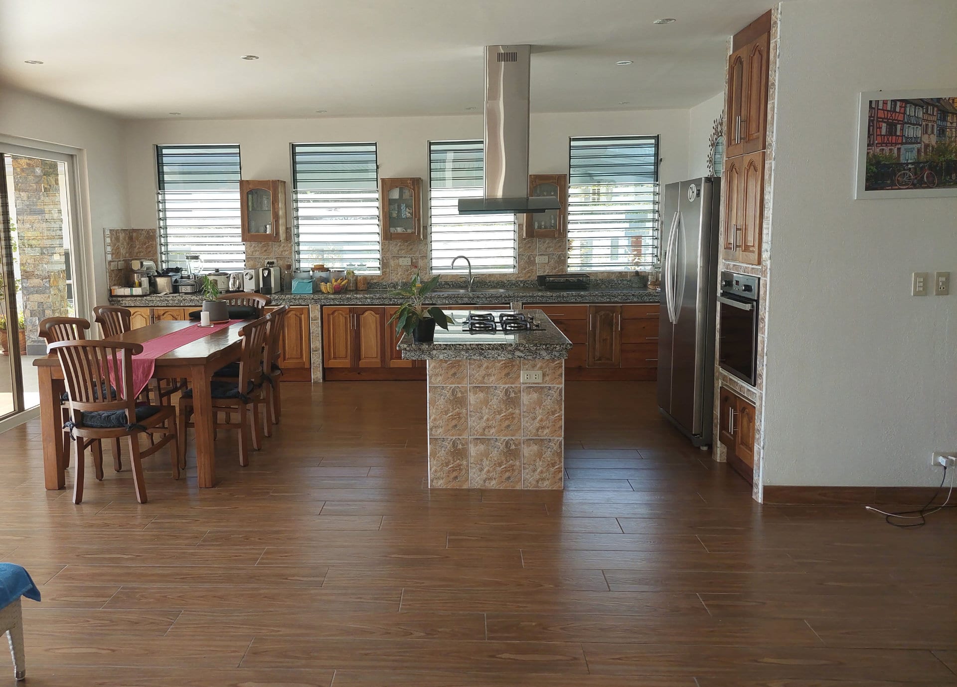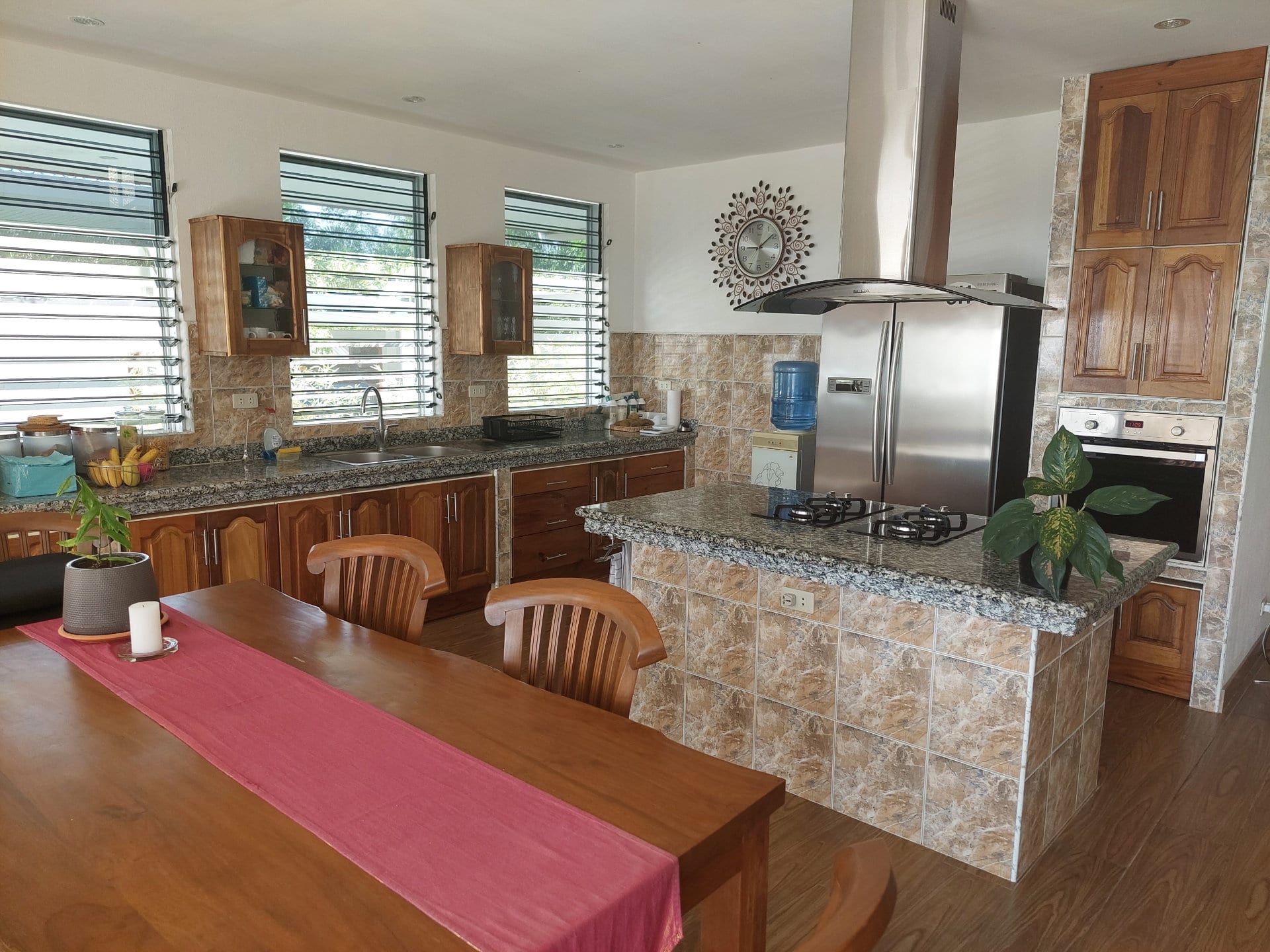 Both are fully equipped and furnished. The kitchen features a cooking island with a 4-burner gas stove, a built-in gas oven, an outdoor gas station (cabinet with two 50kg gas bottles), a microwave, a large side-by-side refrigerator, a water dispenser, and numerous kitchen utensils such as a toaster, rice cooker, coffee machine, etc. The work surface is over 7 meters long and finished with granite slabs. There are also approx. 30 cabinets for food and kitchen utensils.