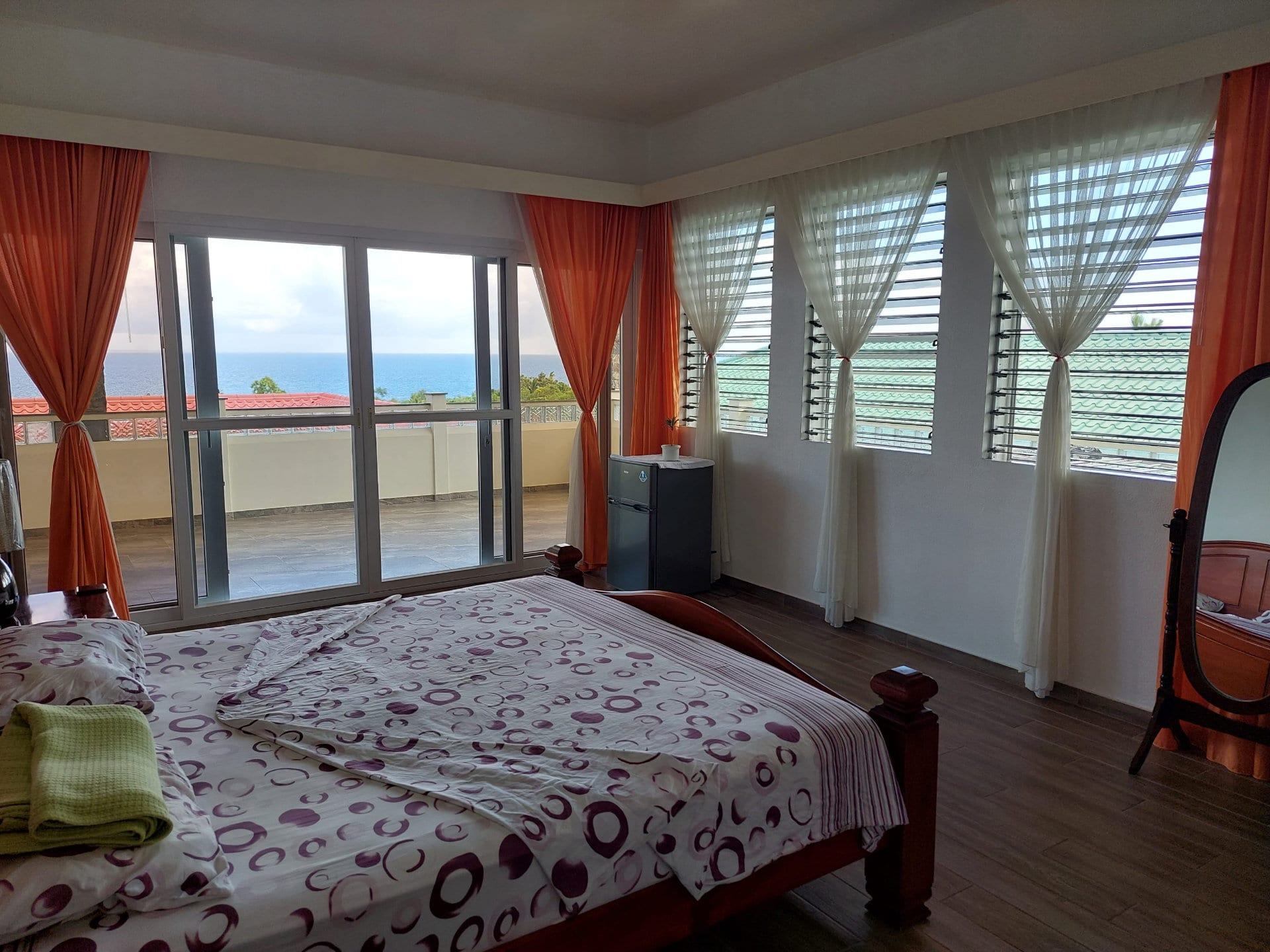 The bedroom features a large window overlooking the balcony, the sea, and the pool. A sliding door provides direct access to the balcony. Adjacent to the bedroom is a walk-in closet with ample storage space and a safe, as well as a bathroom with a toilet, bidet, two sinks, and a glass shower cabin. You can enjoy a beautiful sunrise view from all three rooms.