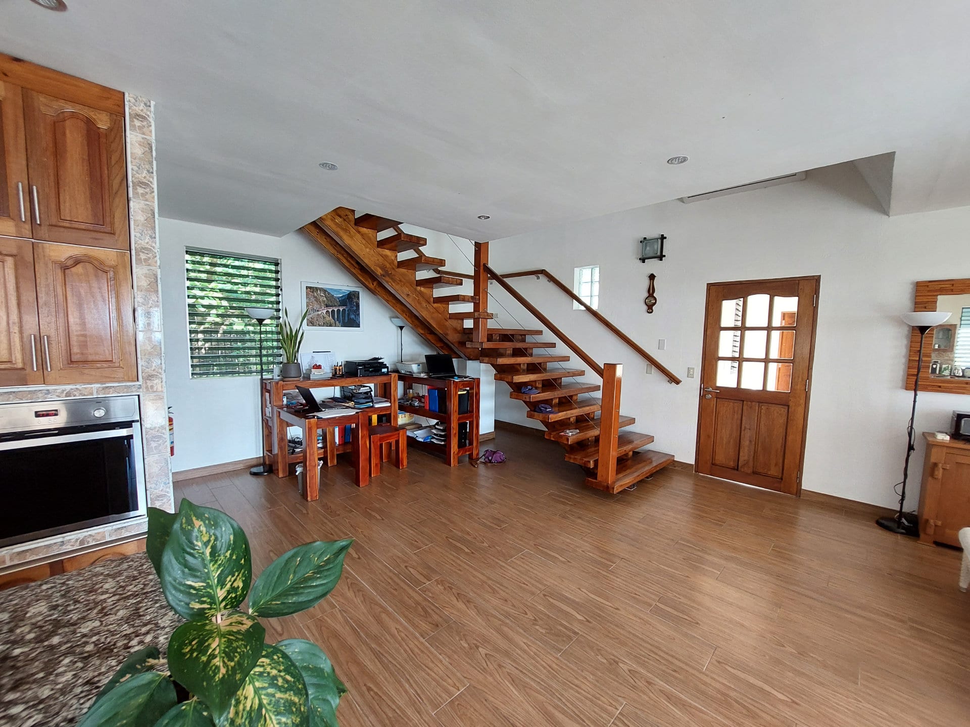 The living room offers a magnificent view of the pool and the sea and features an impressive wooden staircase to the upper floor, a separate toilet with a shower, and a corner that can be used as an office.